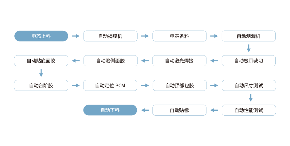 设备简介该自动线主要用于聚合物软包手环手表类电池PACK包装,由15台设备组成,由自动上料机、备料一体机、自动裁切机、自动焊接机、底面包胶、侧面包胶、性能测试、自动下料等设备组成。本自动线只需要调整定位夹具和切换操作页面,可兼容不同规格的电芯。对于不同电芯包胶工艺,可通过操作面板进行选择,兼容性更强,适用性更广。