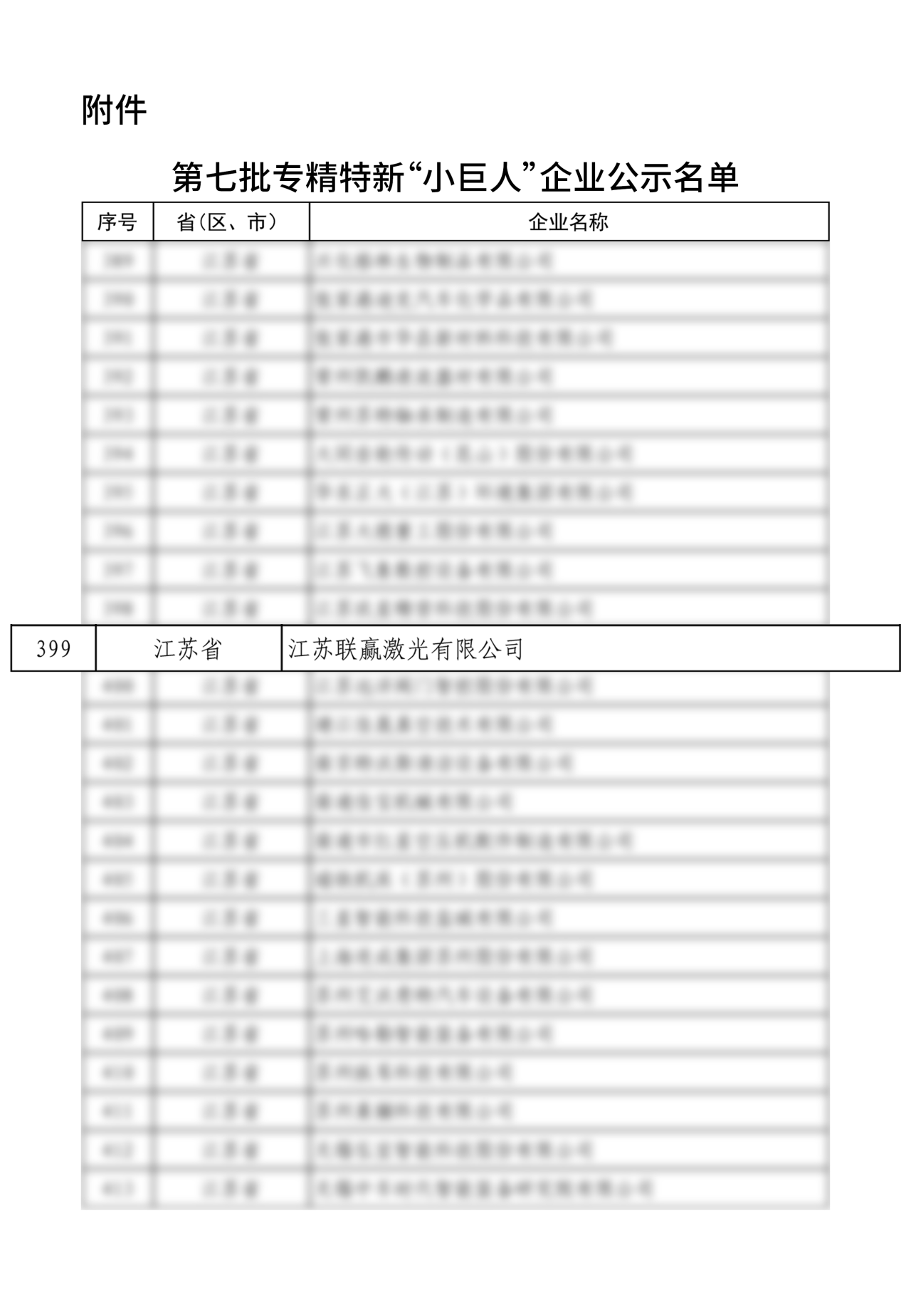 近日,江苏省工业和信息化厅公布了江苏省第七批专精特新 “小巨人” 企业公示名单,联赢激光旗下全资子公司——江苏联赢激光有限公司凭借其在激光智能制造领域的深厚技术积累、持续的创新投入以及显著的市场影响力,成功跻身这一权威榜单。这是继获评“省级企业技术中心”、“省级工业设计中心”等荣誉后,公司在专业化、精细化、特色化、新颖化发展道路上斩获的又一重要里程碑,标志着企业的综合实力与行业引领地位获得了省级层面的高度认可。