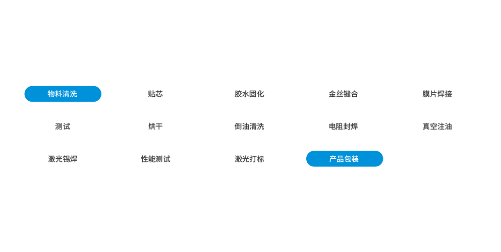 充油芯体组装线包含:贴芯设备、胶水固化设备、等离子清洗设备、金丝键合设备、膜片焊接设备、真空注油设备、抽真空设备、电阻封焊设备、烘干设备、产品下料设备等。激光锡焊设备和打磨设备为单机台生产。生产过程数据记录,信息可追溯。